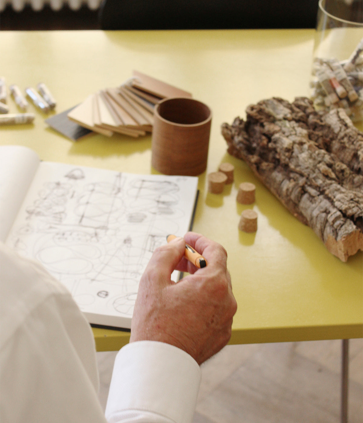 Mine nye designprojekter starter altid som håndskitser i mine sorte skitsebøger. Skitser, der afsøger en idé eller et koncept. Her forsøger jeg at skære alt overflødigt væk, minimere og tydeliggøre idéen, så den fremstår så enkelt og præcist som muligt. Efterhånden som idéen tager form, bliver stregerne mere bevidste.