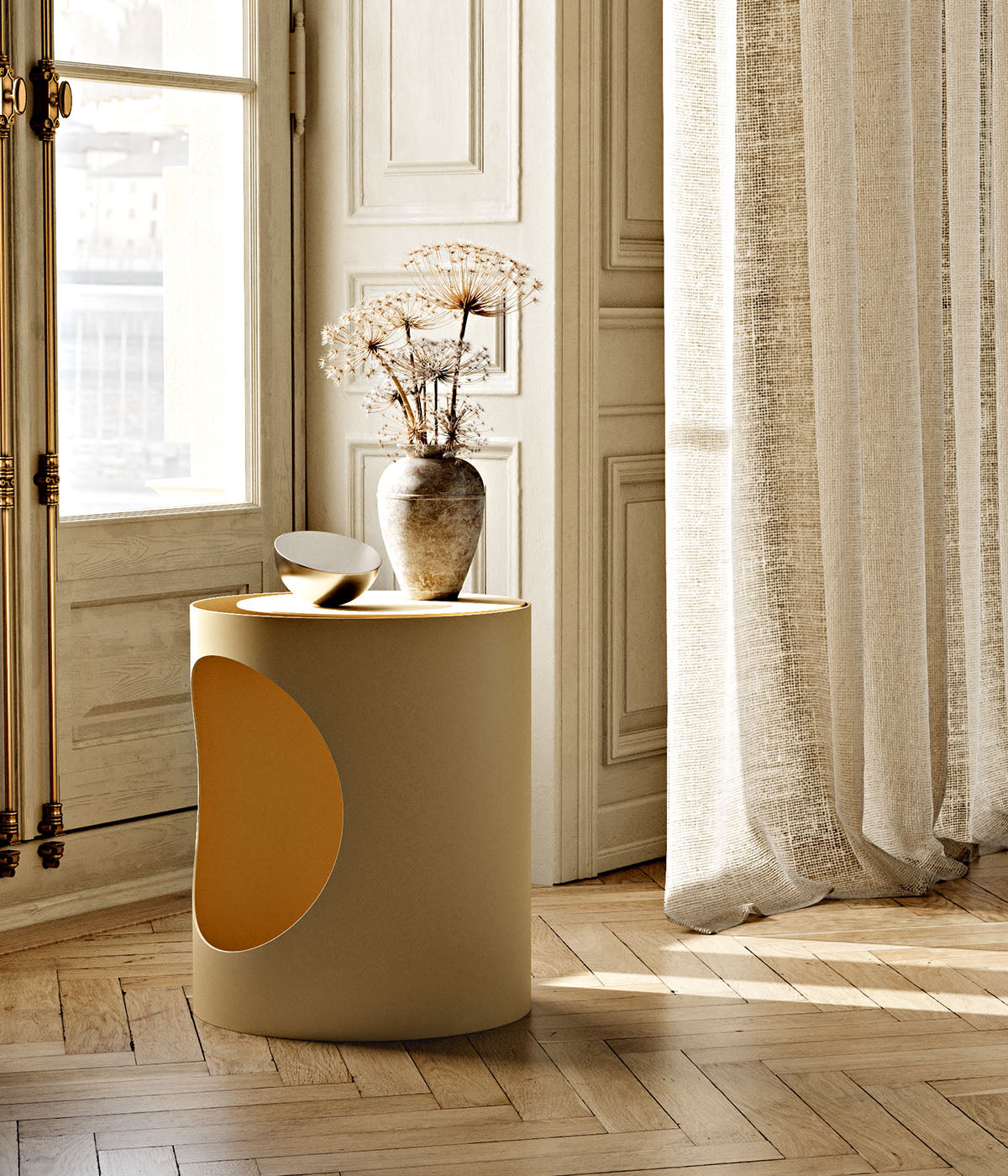 Tag et kig på Tabl. Kan du spotte den skjulte del? En cirkulær del af den klassiske cylindriske base er blevet udskåret og omdannet til en funktionel bordplade. Det efterlader et rundt, åbent rum i fundamentet og skaber en tydelig visuel silhuet. Med denne legende og håndgribelige tilgang optimerer vi materialet, ved at tilføre designet en ny funktion, uden at tilføje ekstra materiale. Samtidig optimerer vi produktionen, da laserskæreren kan skære både fod og bordplade samtidigt. Formen fra åbningen og bordpladen genbruges, hvilket sikrer en ansvarlig og tidlig reduktion af ressourcer.